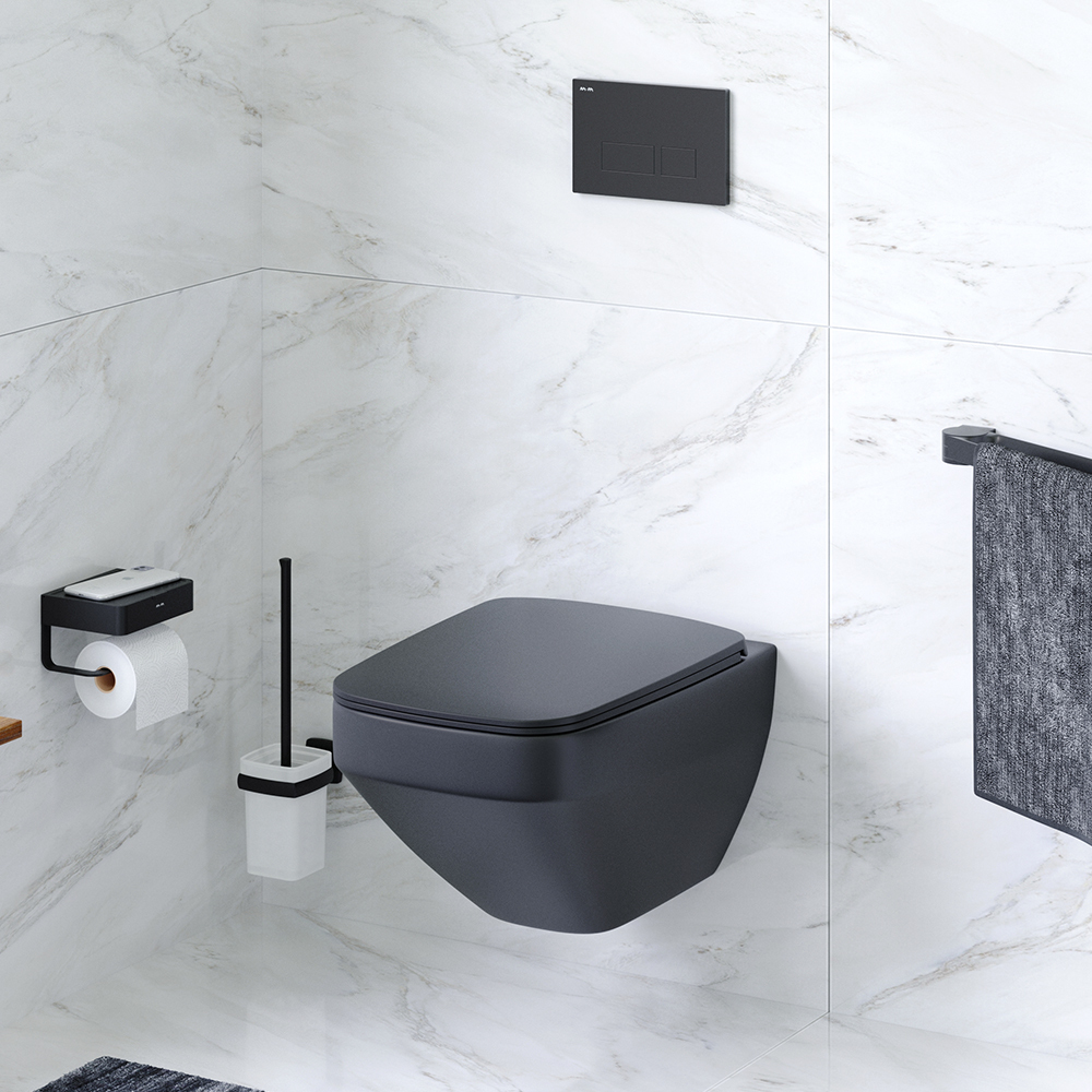 Современный дизайн и новая квадратная форма в керамике АМ.РМ. Теперь и в черном матовом исполнении. FlashClean — новое поколение безободковых унитазов без использования пластика: 100 % гигиеничности 0% брызг.